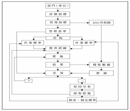 部門管理指標所表現的實績與部門管理基準值比較, 實績比部門管理基準值好時,QMU稱此部門管理指標出現「+」差異。實績比部門管理基準值差時,QMU稱此部門管理指標出現「-」差異。 QMU的作法是當發生「-」差異時,必須應用QC手法追查原因,進行應急措施,並採取再發防止措施。 針對有效果的措施,必須制定或修改標準,提升部門管理基準值的水準,達成改善效果。 (6) 確實轉動部門PDCA管理循環 部門管理者透過部門的維實管理確實轉動PDCA管理循環,就能把握部門的現有實力,瞭解部屬的做事態度與作法,知道部門的運作情形,因為實力不夠的人在部門的維實管理上也無法表現出好的實績。 現場人員若是因不瞭解規定或作業標準而致結果不好,則可進行教育訓練 (應急措施),若是因作業的方法或標準不對, 就要修改或制定標準採取再發防止措施,如此,各部門不斷的轉動PDCA管理循環,部門的日常作業就能愈趨穩定,持續改善並提高部門實力。 以上各項QMU管理的實施作法,可整理成体系圖如圖